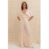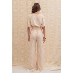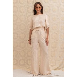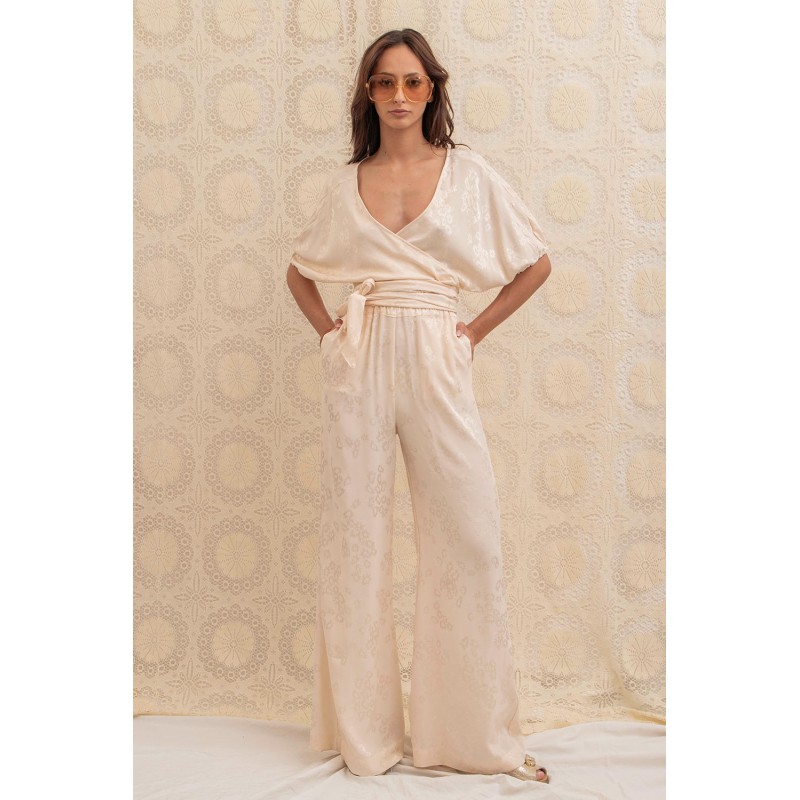 The Anna top features a wrap-around design with a wide tie belt that beautifully sculpts the silhouette. Its batwing shape and puffed short sleeves add a subtle volume, offering natural elegance. Crafted in fluid floral jacquard fabric in cream. Wear it tied at the front for a wrap effect or at the back for a more minimalist look with Gaia pants.