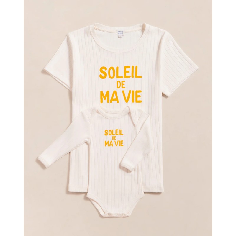 A great way to tell your little darling that he/she is the sunshine of your days, the sunshine of your nights, the sunshine of love - in short, the sunshine of your life! This pretty bodysuits in cream ribbed jersey, with its yellow print, will add a touch of pep to your summer wardrobe! Match it with the adult tee-shirt for an even sweeter effect :)