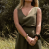 Light, fluid and comfortable, the Nusa top is your new everyday favorite. Thakns to its reversible V neckline, it can be worn front or bcak. Its timeless khaki shade apirs effortssly with jeans, skirts, or wide leg pants. Simple, smart and Paris-made.