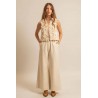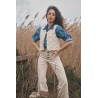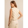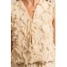 The designer chose a fully fringed fabric, which gives it all its charm and character. Its straight cut, tie-front closure, and sleeveless design make it easy to wear every day, over a dress or a simpler outfit.