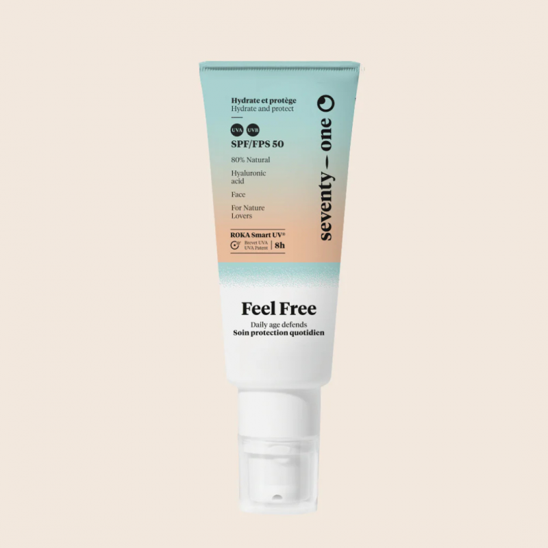 Feel free is more than just a sunscreen, it's a complete hybrid daily care. SPF50, anti-aging, and packed with hyaluronic acid, prebiotics and acnesium, it hydrates and protects while leaving a matte, radiant finish. The perfect base for makeup and for your day.