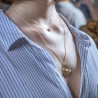 Un sautoir tout en rondeur, facile à porter quelque soit la tenue. Le travail du disque est tel qu'il reflète parfaitement la lumière et la pierre fine au centre est une nacre discrète qui saura apporter une touche précieuse sans alourdir le tombé du collier.